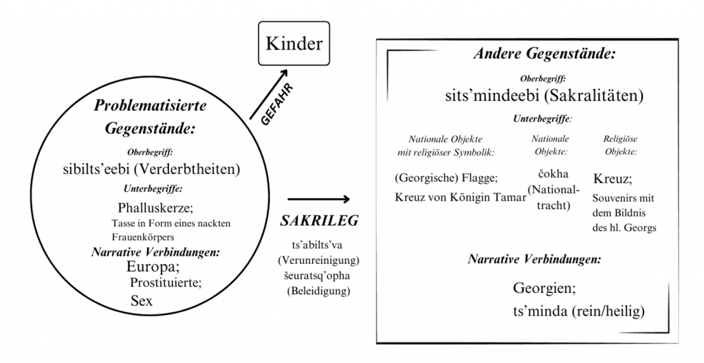 Was aus einer westeuropäischen Perspektive vielleicht wie eine absurde Überreaktion wirkt, ist in Wirklichkeit ein prägnantes Beispiel dafür, wie eng Religion und Nation in Georgien verknüpft sind. Die beiden Aktivistinnen sahen die phallusförmige Kerze nicht nur als ein Souvenir, sondern als Bedrohung einer sakralisierten nationalen Identität. Denn in der öffentlichen Wahrnehmung gelten Symbole wie die georgische Flagge, die traditionelle Tracht oder Volksmusikinstrumente längst nicht mehr nur als kulturelle Zeichen. Sie sind heilig. Ihre Nähe zu etwas „Unreinem“ wird als Angriff auf das Selbstverständnis einer Nation empfunden, deren Identität auf christlich-orthodoxen Werten ruht. Der Vorfall zeigt deutlich, wie politische, religiöse und kulturelle Bedeutungen ineinandergreifen: Die Aktivistinnen nutzten religiöse Empörung gezielt für politische Botschaften, etwa gegen die europäische Integration Georgiens und verwandelten den Konflikt in eine ideologische Auseinandersetzung. Dabei griffen sie auf eine tief kulturell verankerte Symbolsprache zurück, die stark von patriarchalen Stereotypen geprägt ist. Dabei verknüpften sie zugleich Begriffe wie „Europäische Union“ oder „Eurointegration“, um eine narrative Verbindung herzustellen und die Symbole politisch zu instrumentalisieren. So wurde beispielsweise die Phalluskerze, und allgemein die Phallusform, mit Europa assoziiert, während Kreuze und Nationaltrachten mit Georgien gleichgesetzt wurden. Die „Verunreinigung“ der Kreuze durch die Phalluskerzen wurde somit sinnbildlich als „Verunreinigung“ Georgiens durch die Eurointegration gedeutet: