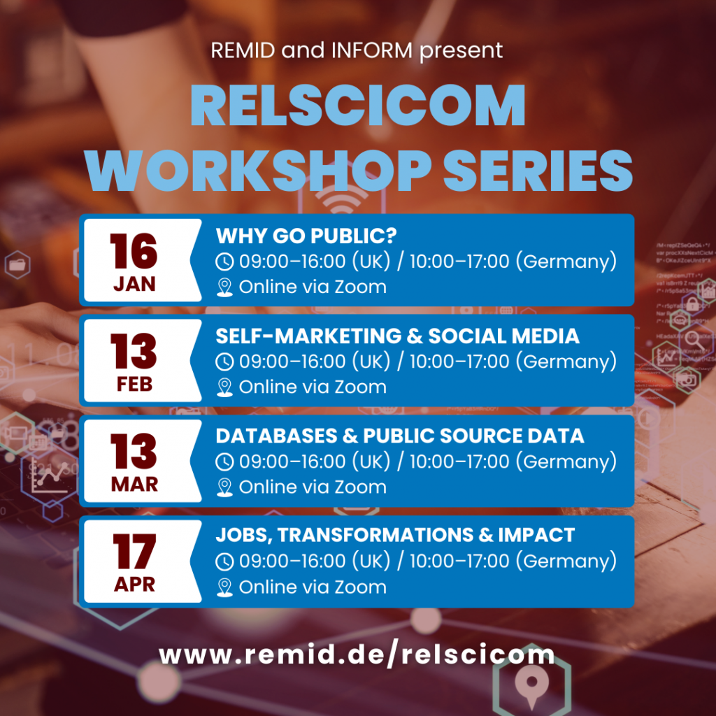 RelSciCom 2026 is a cooperation between INFORM and REMID e.V. It is a series of four workshop days during which participants will learn how, why, and through which media they can communicate their research to the general public. Each workshop will include a panel discussion with experienced researchers, a session to learn techniques and methods of transforming academic research to public knowledge, and a session to put the newly acquired methods to practice.