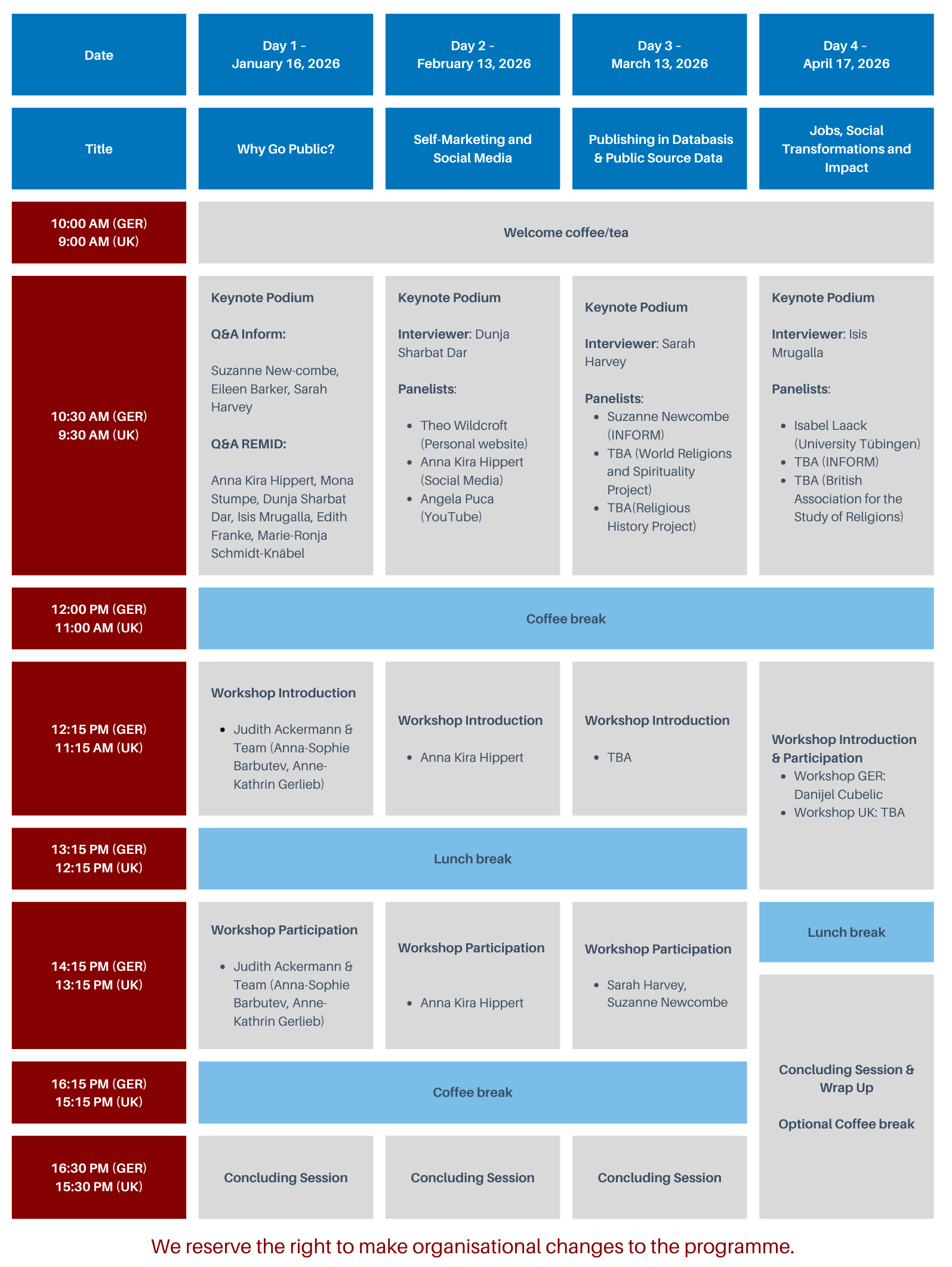 By strengthening communication competencies, participants gain a competitive edge on the job market and for their postdoc projects and learn to engage diverse publics with nuanced, research-based insights. This last workshop day will discuss how Religious Studies students can have a public impact with their research, contributing to social transformation. The practical session will be split into the German and UK contexts, where students will hear from experts in both academia and beyond on careers after the study of religion.