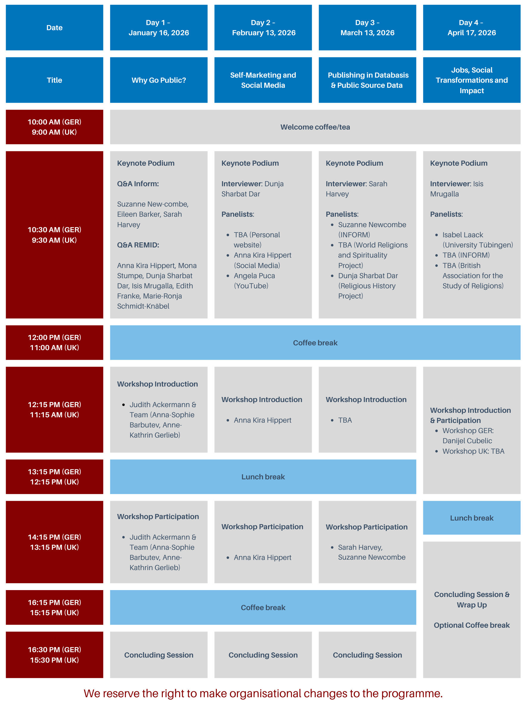 Participants can sign up for one workshop, or for all four, in which case they will receive a certificate of participation. Participants must be PhD students registered at either a British or German University. Workshop dates are 16th January; 13th February; 13th March; 17th April 2026.